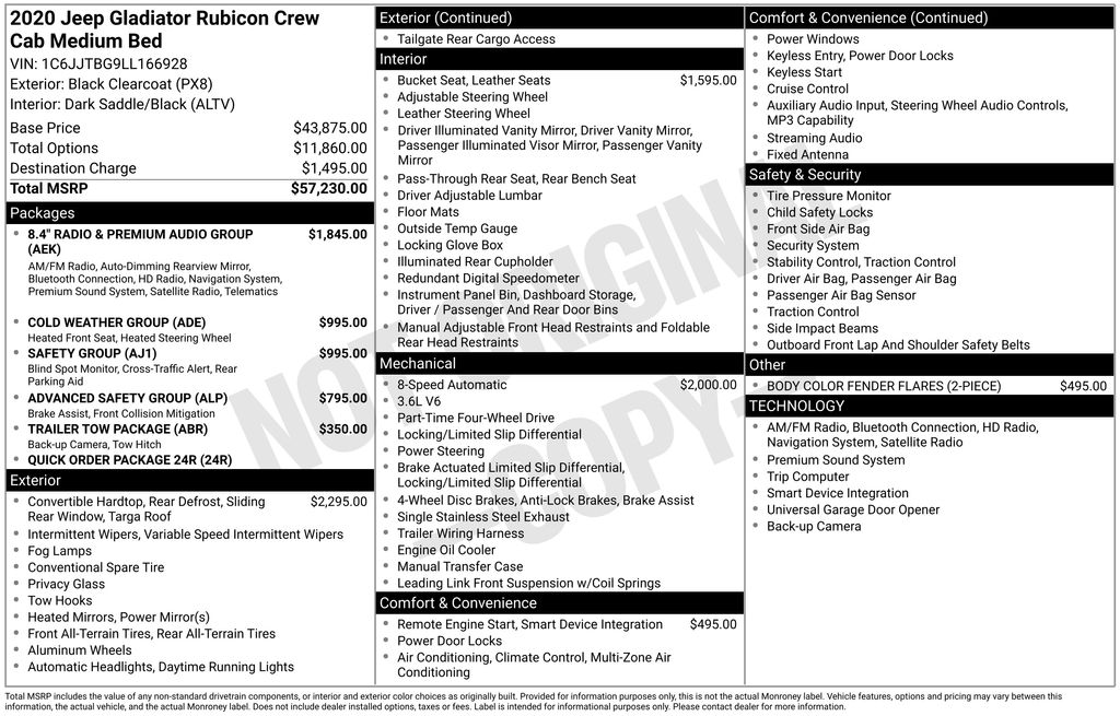 2020 Jeep Gladiator Rubicon Black Clearcoat Rubicon 4WD 8-Speed Automatic 3.6L V6 24V VVT 1-Year SiriusXM Guardian Trial, 240 Amp Alternator, 4-Wheel Disc Brakes, 4.10 Rear Axle Ratio, 5-Year SiriusXM Traffic Service, 5-Year SiriusXM Travel Link Service, 8 Speakers, 8.4" Radio & Premium Audio Group, 97 mph Maximum Speed Calibration, ABS brakes, Advanced Brake Assist, Advanced Safety Group, Air Conditioning, Alloy wheels, Alpine Premium Audio System, AM/FM radio: SiriusXM, Apple CarPlay/Android Auto, Auto-Dimming Rear-View Mirror, Automatic temperature control, Blind Spot & Cross Path Detection, Body Color 3-Piece Hard Top, Body Color Fender Flares (2-Piece), Brake assist, Class IV Hitch Receiver, Cold Weather Group, Compass, Delay-off headlights, Driver door bin, Driver vanity mirror, Dual front impact airbags, Dual front side impact airbags, Electronic Stability Control, Emergency/Assistance Call, For Details, Visit DriveUconnect.com, Freedom Panel Storage Bag, Front anti-roll bar, Front Bucket Seats, Front Center Armrest w/Storage, Front dual zone A/C, Front fog lights, Front reading lights, Full Speed Forward Collision Warning Plus, Fully automatic headlights, Garage door transmitter, HD Radio, Heated door mirrors, Heated Front Seats, Heated Steering Wheel, Heavy-Duty Engine Cooling, Illuminated entry, Integrated roll-over protection, Leather steering wheel, Low tire pressure warning, No Soft Top, Occupant sensing airbag, Outside temperature display, Panic alarm, ParkSense Rear Park Assist System, ParkView Rear Back-Up Camera, Passenger door bin, Passenger vanity mirror, Performance Suspension, Power door mirrors, Power steering, Power windows, Premium Cloth Low-Back Bucket Seats, Quick Order Package 24R, Radio data system, Radio: Uconnect 4 w/7" Display, Radio: Uconnect 4C Nav w/8.4" Display, Rear anti-roll bar, Rear reading lights, Rear Sliding Window, Rear Window Defroster, Remote keyless entry, Remote Start System, Safety Group, Security system, SiriusXM Traffic Plus, SiriusXM Travel Link, Speed control, Split folding rear seat, Steering wheel mounted audio controls, Tachometer, Telescoping steering wheel, Tilt steering wheel, Traction control, Trailer Hitch Zoom, Trailer Tow Package, Trip computer, Variably intermittent wipers, Voltmeter, Wheels: 17" x 7.5" Granite Crystal Aluminum.
