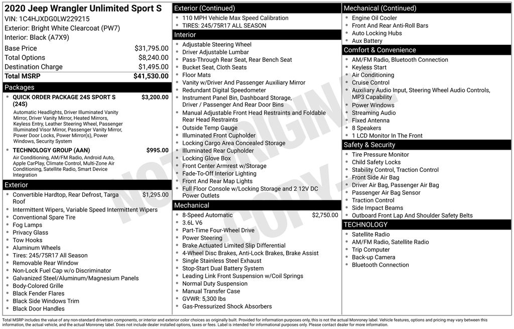 2020 Jeep Wrangler Unlimited Sport S Bright White Clearcoat Unlimited Sport S 4WD 8-Speed Automatic 3.6L V6 24V VVT 1-Year SiriusXM Radio Service, 3.45 Rear Axle Ratio, 4-Wheel Disc Brakes, 7.0" Touchscreen Display, 8 Speakers, ABS brakes, Air Conditioning, Air Conditioning w/Auto Temperature Control, Air Filtering, AM/FM radio, Apple CarPlay (DISC), Automatic Headlamps, Aux Battery, Black 3-Piece Hard Top, Brake assist, Cloth Low-Back Bucket Seats, Cluster 7.0" TFT Color Display, Compass, Deep Tint Sunscreen Windows, Delay-off headlights, Driver door bin, Driver vanity mirror, Dual front impact airbags, Dual front side impact airbags, Electronic Stability Control, Freedom Panel Storage Bag, Front 1-Touch Down Power Windows, Front anti-roll bar, Front Bucket Seats, Front Center Armrest w/Storage, Front fog lights, Front reading lights, Google Android Auto (DISC), GPS Antenna Input, Integrated Center Stack Radio, Integrated roll-over protection, Integrated Voice Command w/Bluetooth, Leather Wrapped Steering Wheel, Low tire pressure warning, No Soft Top, Non-Lock Fuel Cap w/o Discriminator, Normal Duty Suspension, Occupant sensing airbag, Outside temperature display, ParkView Rear Back-Up Camera, Passenger door bin, Passenger vanity mirror, Power Heated Mirrors, Power steering, Quick Order Package 24S Sport S, Radio data system, Radio: Uconnect 3 w/5" Display, Radio: Uconnect 4 w/7" Display, Rear anti-roll bar, Rear reading lights, Rear Window Defroster, Rear Window Wiper/Washer, Remote Keyless Entry, Security Alarm, SiriusXM Satellite Radio, Speed control, Speed Sensitive Power Locks, Split folding rear seat, Steering wheel mounted audio controls, Stop-Start Dual Battery System, Sun Visors w/Illuminated Vanity Mirrors, Tachometer, Technology Group, Telescoping steering wheel, Tilt steering wheel, Traction control, Trip computer, USB Host Flip, Variably intermittent wipers, Wheels: 17" x 7.5" Black Steel Styled, Wheels: 17" x 7.5" Tech Silver Aluminum.