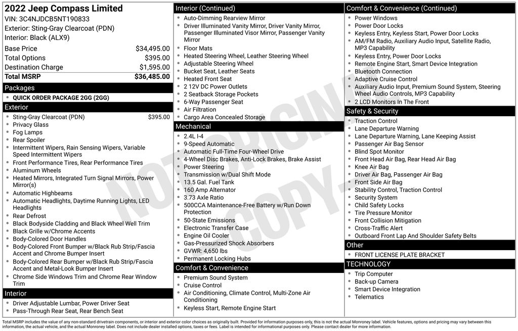 2022 Jeep Compass Limited Sting-Gray Clearcoat Limited 4WD 9-Speed 948TE Automatic 2.4L I4 4WD, 10.1" Touchscreen Display, 3.73 Axle Ratio, 4-Wheel Disc Brakes, 6 Speakers, ABS brakes, Air Conditioning, Alloy wheels, AM/FM radio: SiriusXM, Anti-whiplash front head restraints, Auto High-beam Headlights, Auto-dimming Rear-View mirror, Automatic temperature control, Brake assist, Bumpers: body-color, Compass, Delay-off headlights, Disassociated Touchscreen Display, Driver door bin, Driver vanity mirror, Dual front impact airbags, Dual front side impact airbags, Electronic Stability Control, Emergency communication system: SiriusXM Guardian, Four wheel independent suspension, Front anti-roll bar, Front Bucket Seats, Front Center Armrest w/Storage, Front dual zone A/C, Front fog lights, Front License Plate Bracket, Front reading lights, Fully automatic headlights, Global Telematics Box Module (TBM), Gloss Black Exterior Mirrors, Heated door mirrors, Heated front seats, Heated steering wheel, Illuminated entry, Knee airbag, Leather Shift Knob, Leather Trimmed Bucket Seats, Low tire pressure warning, Occupant sensing airbag, Outside temperature display, Overhead airbag, Overhead console, Panic alarm, ParkView Rear Back-Up Camera, Passenger door bin, Passenger vanity mirror, Power door mirrors, Power driver seat, Power steering, Power windows, Quick Order Package 2GG, Radio: Uconnect 5 w/10.1" Display, Rain sensing wipers, Rear anti-roll bar, Rear seat center armrest, Rear window defroster, Rear window wiper, Remote keyless entry, Roof rack: rails only, Security system, Speed control, Split folding rear seat, Spoiler, Steering wheel mounted audio controls, Tachometer, Telescoping steering wheel, Tilt steering wheel, Traction control, Trip computer, Turn signal indicator mirrors, Variably intermittent wipers, Wheels: 18" x 7" Painted Diamond Cut Aluminum, 4WD.