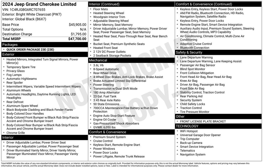 2024 Jeep Grand Cherokee Limited Bright White Clearcoat Limited RWD 8-Speed Automatic 3.6L V6 24V VVT 3.45 Rear Axle Ratio, 4-Wheel Disc Brakes, 6 Speakers, ABS brakes, Active Noise Control System, Air Conditioning, Alloy wheels, AM/FM radio: SiriusXM with 360L, Anti-whiplash front head restraints, Audio memory, Auto High-beam Headlights, Automatic temperature control, Brake assist, Bumpers: body-color, Capri Leatherette Seats, Compass, Delay-off headlights, Driver door bin, Driver vanity mirror, Dual front impact airbags, Dual front side impact airbags, Electronic Stability Control, Emergency communication system, Four wheel independent suspension, Front anti-roll bar, Front Bucket Seats, Front Center Armrest w/Storage, Front dual zone A/C, Front fog lights, Front License Plate Bracket, Front reading lights, Fully automatic headlights, Garage door transmitter, Heated door mirrors, Heated front seats, Heated rear seats, Heated steering wheel, Illuminated entry, Knee airbag, Low tire pressure warning, Memory seat, Navigation System, Normal Duty Suspension, Occupant sensing airbag, Outside temperature display, Overhead airbag, Overhead console, Panic alarm, ParkView Rear Back-Up Camera, Passenger door bin, Passenger vanity mirror, Power door mirrors, Power driver seat, Power Liftgate, Power passenger seat, Power steering, Power windows, Quick Order Package 23E, Radio data system, Radio: Uconnect 5 Nav w/10.1" Display, Rear anti-roll bar, Rear reading lights, Rear window defroster, Rear window wiper, Remote keyless entry, Security system, Speed control, Speed-Sensitive Wipers, Split folding rear seat, Spoiler, Steering wheel mounted audio controls, Tachometer, Telescoping steering wheel, Tilt steering wheel, Traction control, Trip computer, Turn signal indicator mirrors, Variably intermittent wipers, Voltmeter, Wheels: 18" x 8" Polished/Painted Aluminum.