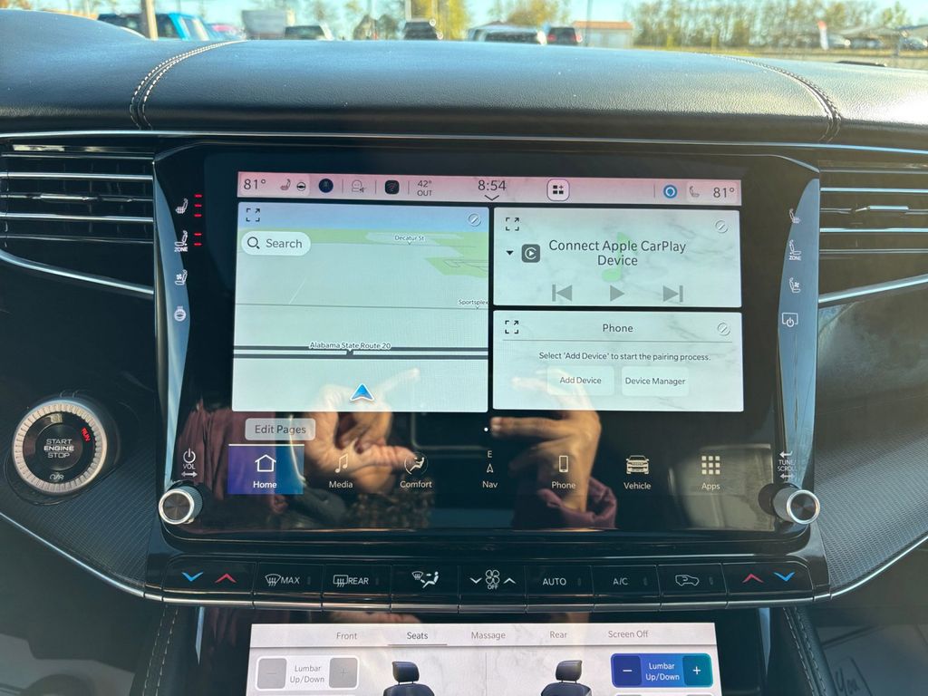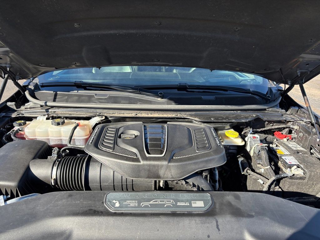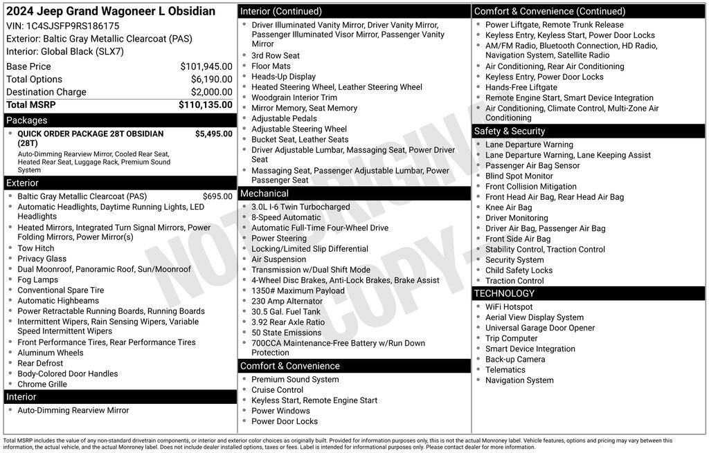 2024 Jeep Grand Wagoneer L Series II Baltic Gray Metallic Clearcoat Series II 4WD 8-Speed Automatic 3.0L I6 19 Speakers, 23 Speaker McIntosh Reference Audio System, 3.92 Rear Axle Ratio, 3rd row seats: bench, 4-Wheel Disc Brakes, ABS brakes, Adjustable pedals, Adjustable Roof Rail Crossbars, Air Conditioning, Alloy wheels, AM/FM radio: SiriusXM with 360L, Anti-whiplash front head restraints, Apple CarPlay/Android Auto, Audio memory, Auto High-beam Headlights, Auto-dimming door mirrors, Auto-dimming Rear-View mirror, Auto-leveling suspension, Automatic temperature control, Black Interior Accents, Black Roof, Brake assist, Bumpers: body-color, Compass, Delay-off headlights, Driver door bin, Driver vanity mirror, Driver's Seat Mounted Armrest, Dual front impact airbags, Dual front side impact airbags, Electronic Stability Control, Emergency communication system, Four wheel independent suspension, Front anti-roll bar, Front Bucket Seats, Front Center Armrest w/Storage, Front Console Cooler, Front dual zone A/C, Front fog lights, Front Passenger Interactive Display, Front reading lights, Fully automatic headlights, Garage door transmitter, Genuine wood console insert, Genuine wood dashboard insert, Genuine wood door panel insert, Gloss Black Upper & Lower DLO Molding, Heads-Up Display, Heated door mirrors, Heated front seats, Heated rear seats, Heated steering wheel, Illuminated entry, Knee airbag, Leather steering wheel, Leather Trimmed Bucket Seats, Low tire pressure warning, Memory seat, Navigation System, Normal Duty Suspension, Obsidian Appearance Package, Occupant sensing airbag, Outside temperature display, Overhead airbag, Overhead console, Panic alarm, Passenger door bin, Passenger seat mounted armrest, Passenger vanity mirror, Pedal memory, Piano Black Exterior Accents, Power adjustable front head restraints, Power door mirrors, Power driver seat, Power Liftgate, Power moonroof, Power passenger seat, Power steering, Power windows, Quick Order Package 28T Obsidian, Radio data system, Radio: Uconnect 5 Nav w/12.0" Display, Rain sensing wipers, Rear air conditioning, Rear anti-roll bar, Rear dual zone A/C, Rear reading lights, Rear seat center armrest, Rear window defroster, Rear window wiper, Rearview Autodim Digital Display Mirror, Reclining 3rd row seat, Remote keyless entry, Security system, Speed control, Speed-sensing steering, Speed-Sensitive Wipers, Split folding rear seat, Steering wheel memory, Steering wheel mounted audio controls, Tachometer, Telescoping steering wheel, Tilt steering wheel, Traction control, Trip computer, Turn signal indicator mirrors, Two Tone Paint Group, Variably intermittent wipers, Ventilated front seats, Ventilated Rear Seats, Voltmeter, Wheels: 22" x 9.0" Tinted Polished w/Black Insert.