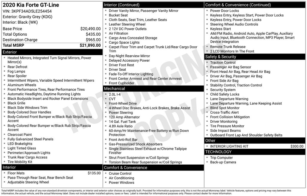 2020 Kia Forte GT-Line Gravity Gray GT-Line FWD CVT 2.0L 4-Cylinder MPI 4-Wheel Disc Brakes, 6 Speakers, ABS brakes, Air Conditioning, Alloy wheels, AM/FM radio, Apple CarPlay & Android Auto, Brake assist, Bumpers: body-color, Carpet Floor Mats, Cloth & Leatherette Seat Trim, Delay-off headlights, Driver door bin, Driver vanity mirror, Dual front impact airbags, Dual front side impact airbags, Electronic Stability Control, Exterior Parking Camera Rear, Front anti-roll bar, Front Bucket Seats, Front Center Armrest, Front fog lights, Front reading lights, Front Sport Seats, Front wheel independent suspension, Fully automatic headlights, Heated door mirrors, Illuminated entry, Interior Lighting Kit, Leather Shift Knob, Leather steering wheel, Low tire pressure warning, Occupant sensing airbag, Overhead airbag, Overhead console, Panic alarm, Passenger door bin, Passenger vanity mirror, Power door mirrors, Power steering, Power windows, Radio data system, Radio: AM/FM/MP3 Audio System, Rear seat center armrest, Rear window defroster, Remote keyless entry, Security system, Speed control, Split folding rear seat, Spoiler, Steering wheel mounted audio controls, Tachometer, Telescoping steering wheel, Tilt steering wheel, Traction control, Trip computer, Turn signal indicator mirrors, Variably intermittent wipers, Wheels: 17" Graphite Finish Alloy.