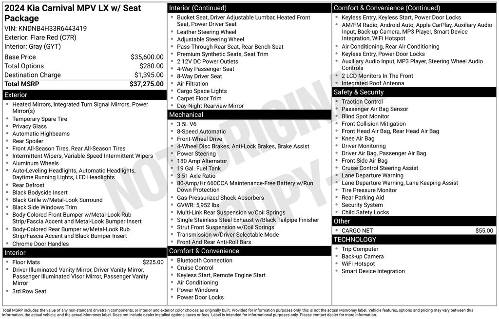 2024 Kia Carnival LX Flare Red LX FWD 8-Speed Automatic V6 3.51 Axle Ratio, 3rd row seats: split-bench, 4-Wheel Disc Brakes, 6 Speakers, ABS brakes, Air Conditioning, Alloy wheels, AM/FM radio, Apple CarPlay & Android Auto, Auto High-beam Headlights, Brake assist, Bumpers: body-color, Cargo Net, Delay-off headlights, Driver door bin, Driver vanity mirror, Dual front impact airbags, Dual front side impact airbags, Electronic Stability Control, Four wheel independent suspension, Front anti-roll bar, Front Bucket Seats, Front Center Armrest, Front reading lights, Fully automatic headlights, Heated door mirrors, Illuminated entry, Knee airbag, Leather Shift Knob, Low tire pressure warning, Occupant sensing airbag, Outside temperature display, Overhead airbag, Overhead console, Panic alarm, Passenger door bin, Passenger vanity mirror, Power door mirrors, Power steering, Power windows, Radio: AM/FM Audio System, Rear air conditioning, Rear anti-roll bar, Rear reading lights, Rear window defroster, Rear window wiper, Reclining 3rd row seat, Remote keyless entry, Security system, Speed control, Speed-sensing steering, Split folding rear seat, Spoiler, Steering wheel mounted audio controls, Tachometer, Telescoping steering wheel, Tilt steering wheel, Traction control, Trip computer, Turn signal indicator mirrors, Variably intermittent wipers, Wheels: 6.5J x 17" Clear Silver Painted Alloy.