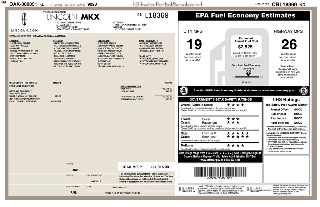 2012 Lincoln MKX Base White Platinum Clearcoat Metallic FWD 6-Speed Automatic with Select-Shift 3.7L V6 Ti-VCT 24V 10 Speakers, 18" Premium Painted Aluminum Wheels, 3.16 Axle Ratio, 4-Wheel Disc Brakes, ABS brakes, Air Conditioning, Alloy wheels, AM/FM radio: SIRIUS, Auto-dimming door mirrors, Auto-dimming Rear-View mirror, Automatic temperature control, Brake assist, Bumpers: body-color, CD player, Compass, Delay-off headlights, Driver door bin, Driver vanity mirror, Driver's Seat Mounted Armrest, Dual front impact airbags, Dual front side impact airbags, Electronic Stability Control, Four wheel independent suspension, Front anti-roll bar, Front Bucket Seats, Front dual zone A/C, Front fog lights, Front License Plate Bracket, Front reading lights, Fully automatic headlights, Garage door transmitter: HomeLink, Heated door mirrors, Heated front seats, Illuminated entry, Low tire pressure warning, Memory seat, Occupant sensing airbag, Order Code 100A, Outside temperature display, Overhead airbag, Overhead console, Panic alarm, Passenger door bin, Passenger seat mounted armrest, Passenger vanity mirror, Perforated Leather-Trimmed Bucket Seats, Power door mirrors, Power driver seat, Power Liftgate, Power passenger seat, Power steering, Power windows, Radio data system, Radio: Premium AM/FM Stereo/CD/MP3, Rear anti-roll bar, Rear Parking Sensors, Rear reading lights, Rear seat center armrest, Rear window defroster, Rear window wiper, Remote keyless entry, Security system, SIRIUS Satellite Radio, Speed control, Speed-Sensitive Wipers, Split folding rear seat, Spoiler, Steering wheel mounted A/C controls, Steering wheel mounted audio controls, Tachometer, Telescoping steering wheel, Tilt steering wheel, Traction control, Trip computer, Variably intermittent wipers, Ventilated front seats.