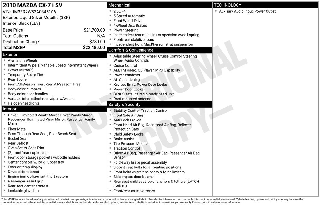 2010 Mazda CX-7 i SV Liquid Silver Metallic i SV FWD 5-Speed Automatic Electronic Sport 2.5L I4 DOHC VVT 16V 17" x 7.0J Aluminum Alloy Wheels, 3.863 Axle Ratio, 4 Speakers, 4-Wheel Disc Brakes, ABS brakes, Air Conditioning, Alloy wheels, AM/FM/CD Audio System w/MP3 Capability, Anti-whiplash front head restraints, Brake assist, Bumpers: body-color, CD player, Cloth-Trimmed Seat Upholstery, Driver door bin, Driver vanity mirror, Dual front impact airbags, Dual front side impact airbags, Electronic Stability Control, Four wheel independent suspension, Front anti-roll bar, Front Bucket Seats, Front Center Armrest, Front reading lights, Illuminated entry, Low tire pressure warning, Occupant sensing airbag, Outside temperature display, Overhead airbag, Panic alarm, Passenger door bin, Passenger vanity mirror, Power door mirrors, Power steering, Power windows, Rear anti-roll bar, Rear seat center armrest, Rear window defroster, Rear window wiper, Reclining Front Bucket Seats, Remote keyless entry, Speed control, Speed-sensing steering, Split folding rear seat, Spoiler, Steering wheel mounted audio controls, Tachometer, Telescoping steering wheel, Tilt steering wheel, Traction control, Trip computer, Variably intermittent wipers.