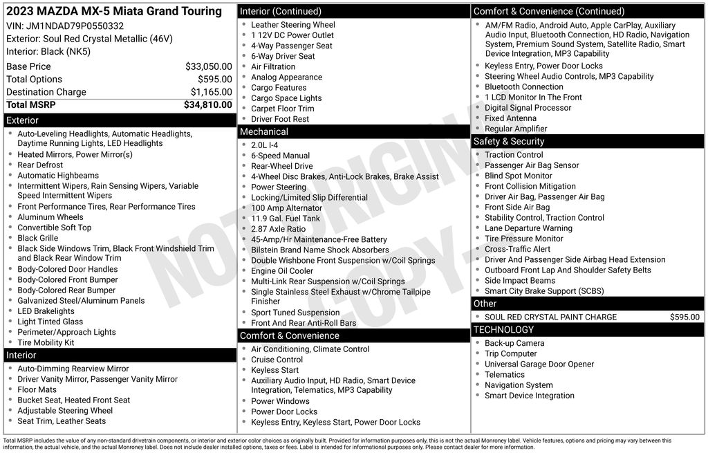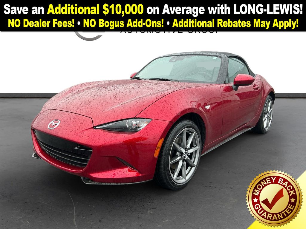 2023 Mazda MX-5 Miata Grand Touring Soul Red Crystal Metallic Grand Touring RWD 6-Speed Manual 2.0L 4-Cylinder DOHC 16V 4-Wheel Disc Brakes, 9 Speakers, ABS brakes, Air Conditioning, Alloy wheels, AM/FM radio: SiriusXM, AppLink/Apple CarPlay and Android Auto, Auto High-beam Headlights, Auto-dimming door mirrors, Auto-dimming Rear-View mirror, Automatic temperature control, Brake assist, Bumpers: body-color, Convertible roof lining, Convertible roof wind blocker, Delay-off headlights, Driver vanity mirror, Dual front impact airbags, Dual front side impact airbags, Electronic Stability Control, Emergency communication system: MAZDA CONNECT, Exterior Parking Camera Rear, Four wheel independent suspension, Front anti-roll bar, Front Bucket Seats, Front Center Armrest, Fully automatic headlights, Garage door transmitter: HomeLink, Glass rear window, Heated door mirrors, Heated Front Bucket Seats, Heated front seats, Illuminated entry, Leather Shift Knob, Leather Upholstery w/Light Gray Stitching, Low tire pressure warning, MAZDA CONNECT, Navigation System, Occupant sensing airbag, Outside temperature display, Panic alarm, Passenger vanity mirror, Power door mirrors, Power steering, Power windows, Radio data system, Radio: Bose Audio System w/AudioPilot, Rain sensing wipers, Rear anti-roll bar, Rear window defroster, Remote keyless entry, Soul Red Crystal Paint Charge, Speed control, Speed-sensing steering, Sport steering wheel, Steering wheel mounted audio controls, Tachometer, Telescoping steering wheel, Tilt steering wheel, Traction control, Trip computer, Variably intermittent wipers, Wheels: 17" x 7" Dark Silver Aluminum Alloy.