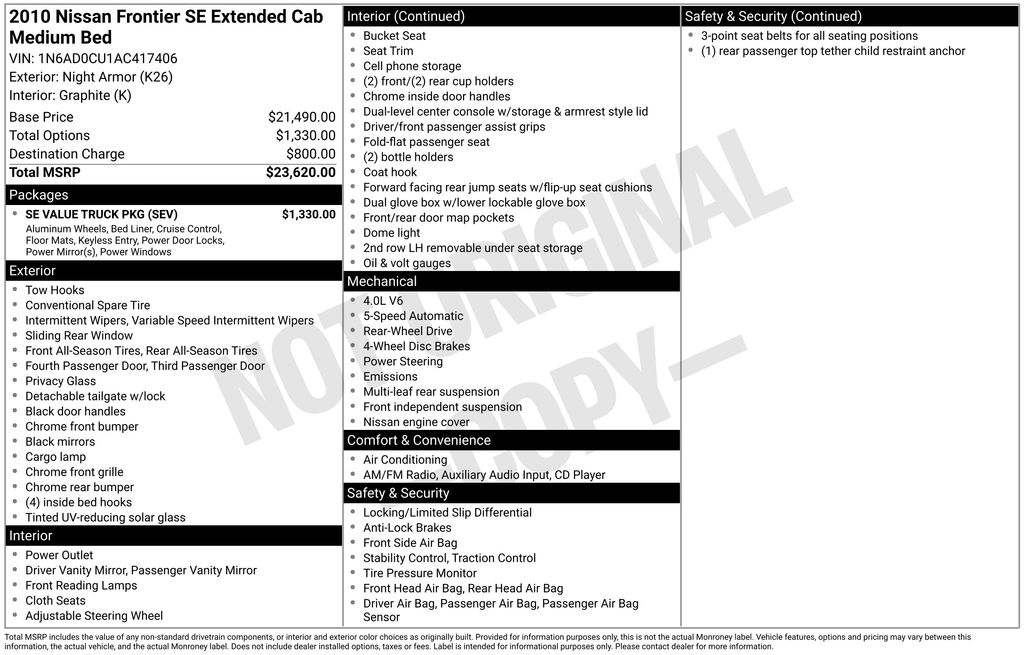 2010 Nissan Frontier SE I4 Night Armor Pearl/Mica SE I4 RWD 5-Speed Automatic with Overdrive 4.0L V6 DOHC 4.0L V6 DOHC, 16" Styled Steel Wheels, 3.133 Axle Ratio, 4 Speakers, 4-Wheel Disc Brakes, ABS brakes, Air Conditioning, AM/FM radio, AM/FM/CD Radio, Anti-whiplash front head restraints, Bumpers: chrome, CD player, Cloth Seat Trim, Cruise Control, Driver door bin, Driver vanity mirror, Drop-In Bedliner, Dual front impact airbags, Dual front side impact airbags, Electronic Stability Control, Front anti-roll bar, Front Bucket Seats, Front Center Armrest, Front reading lights, Front wheel independent suspension, Low tire pressure warning, Microfilter, Occupant sensing airbag, Overhead airbag, Passenger door bin, Passenger vanity mirror, Power Door Locks w/Auto Lock, Power Outside Mirrors, Power steering, Power Windows w/Auto Down Feature, Rear step bumper, Reclining Front Bucket Seats, Remote Keyless Entry, SE Value Truck Package, Speed-sensing steering, Split folding rear seat, Tachometer, Tilt steering wheel, Traction control, Variably intermittent wipers, Voltmeter, 4.0L V6 DOHC.