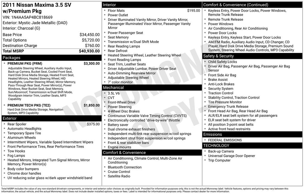 2011 Nissan Maxima 3.5 SV Mystic Jade Metallic 3.5 SV FWD CVT 3.5L V6 DOHC 24V 18" Aluminum Alloy Wheels, 2-Driver Memory System, 2GB Music Box, 4-Wheel Disc Brakes, 7" Color Monitor & Rear View Monitor, 7" Touch-Screen Color Monitor w/VGA Display, 9 Speakers, 9.3GB Music Box HD, ABS brakes, Air Conditioning, Alloy wheels, AM/FM radio: XM, Anti-whiplash front head restraints, Auto-dimming Rear-View mirror, Automatic Entry/Exit, Automatic temperature control, Bluetooth® Streaming Audio, Brake assist, Bumpers: body-color, CD player, Climate Controlled Driver's Seat, Compass, Delay-off headlights, Driver door bin, Driver vanity mirror, Dual front impact airbags, Dual front side impact airbags, Dual-Panel Moonroof w/Power Retractable Sunshades, Electronic Stability Control, Eucalyptus Wood-Tone Trim, Floor Mats/Trunk Mat (5-Piece Set), Four wheel independent suspension, Front anti-roll bar, Front Bucket Seats, Front Center Armrest w/Storage, Front dual zone A/C, Front fog lights, Front reading lights, Fully automatic headlights, Garage door transmitter: HomeLink, Heated Front Seats, Heated Outside Mirrors, Heated Steering Wheel, High-Intensity Discharge Xenon Headlights, Illuminated entry, Leather Seat Trim, Leather Shift Knob, Leather steering wheel, Lg Rear-Seat Fold-Down Center Armrest w/Finisher, Low tire pressure warning, Memory Driver's Seat, Memory Outside Mirrors, Memory Steering Wheel, Nissan Hard Drive Navigation System with Voice Recognition, Occupant sensing airbag, Outside Mirrors w/Reverse Tilt-Down Feature, Outside temperature display, Overhead airbag, Overhead console, Panic alarm, Passenger door bin, Passenger vanity mirror, Power door mirrors, Power driver seat, Power moonroof, Power passenger seat, Power Rear Window Sunshade, Power steering, Power windows, Premium Leather Steering Wheel w/Stitch & Dimple, Premium Leather-Appointed Seat Trim, Premium Package, Premium Technology Package, Radio data system, Radio: AM/FM In-Dash 6-CD w/Bose Audio System, Rear anti-roll bar, Rear Bucket Seats, Rear reading lights, Rear seat center armrest, Rear Spoiler, Rear window defroster, Rear Windows w/1-Touch Auto Up/Down, Remote keyless entry, Security system, Shift Knob, Speed control, Speed-sensing steering, Speed-Sensitive Wipers, Split folding rear seat, Steering wheel mounted audio controls, Tachometer, Telescoping steering wheel, Tilt steering wheel, Traction control, Trip computer, Turn signal indicator mirrors, Variably intermittent wipers, XM NavTraffic & NavWeather.
