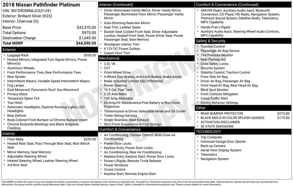 2018 Nissan Pathfinder Platinum Brilliant Silver Metallic Platinum FWD CVT with Xtronic V6 13 Speakers, 3rd row seats: bench, 4-Wheel Disc Brakes, 5.25 Axle Ratio, ABS brakes, Activation Disclaimer, Air Conditioning, Alloy wheels, AM/FM radio: SiriusXM, Auto tilt-away steering wheel, Auto-dimming Rear-View mirror, Automatic temperature control, Black Mold-In Color Splash Guards, Blind Spot Warning, Bodyside moldings, Brake assist, Bumpers: body-color, Carpeted Floor Mats (4-pc Set), CD player, Cross Bars, Delay-off headlights, Driver door bin, Driver vanity mirror, Dual front impact airbags, Dual front side impact airbags, Electronic Stability Control, Emergency communication system: NissanConnect Services, Four wheel independent suspension, Front anti-roll bar, Front Bucket Seats, Front Center Armrest, Front dual zone A/C, Front fog lights, Front Heated & Cooled Bucket Seats, Front reading lights, Fully automatic headlights, Garage door transmitter: HomeLink, Heated door mirrors, Heated front seats, Heated rear seats, Heated steering wheel, Illuminated entry, Leather Seating Surfaces, Leather Shift Knob, Leather steering wheel, Low tire pressure warning, Memory seat, Navigation System, Occupant sensing airbag, Outside temperature display, Overhead airbag, Overhead console, Panic alarm, Passenger door bin, Passenger vanity mirror, Power door mirrors, Power driver seat, Power Liftgate, Power moonroof, Power passenger seat, Power steering, Power windows, Radio data system, Radio: Bose Premium Audio w/AM/FM/CD & 13 Speakers, Rear air conditioning, Rear anti-roll bar, Rear Bumper Protector, Rear Parking Sensors, Rear reading lights, Rear seat center armrest, Rear window defroster, Rear window wiper, Reclining 3rd row seat, Remote keyless entry, Roof rack: rails only, Security system, Speed control, Speed-sensing steering, Speed-Sensitive Wipers, Split folding rear seat, Spoiler, Steering wheel memory, Steering wheel mounted audio controls, Tachometer, Telescoping steering wheel, Tilt steering wheel, Traction control, Trip computer, Turn signal indicator mirrors, Variably intermittent wipers, Ventilated front seats, Wheels: 20" Machined Alloy w/Dark Met Gray Finish.