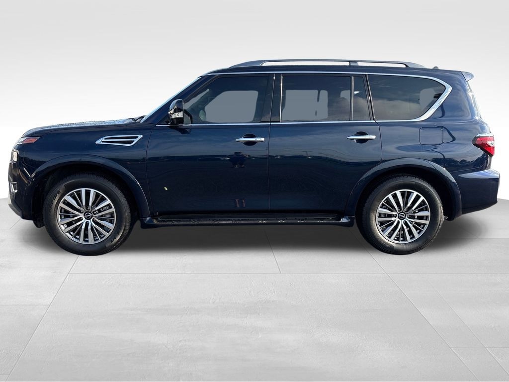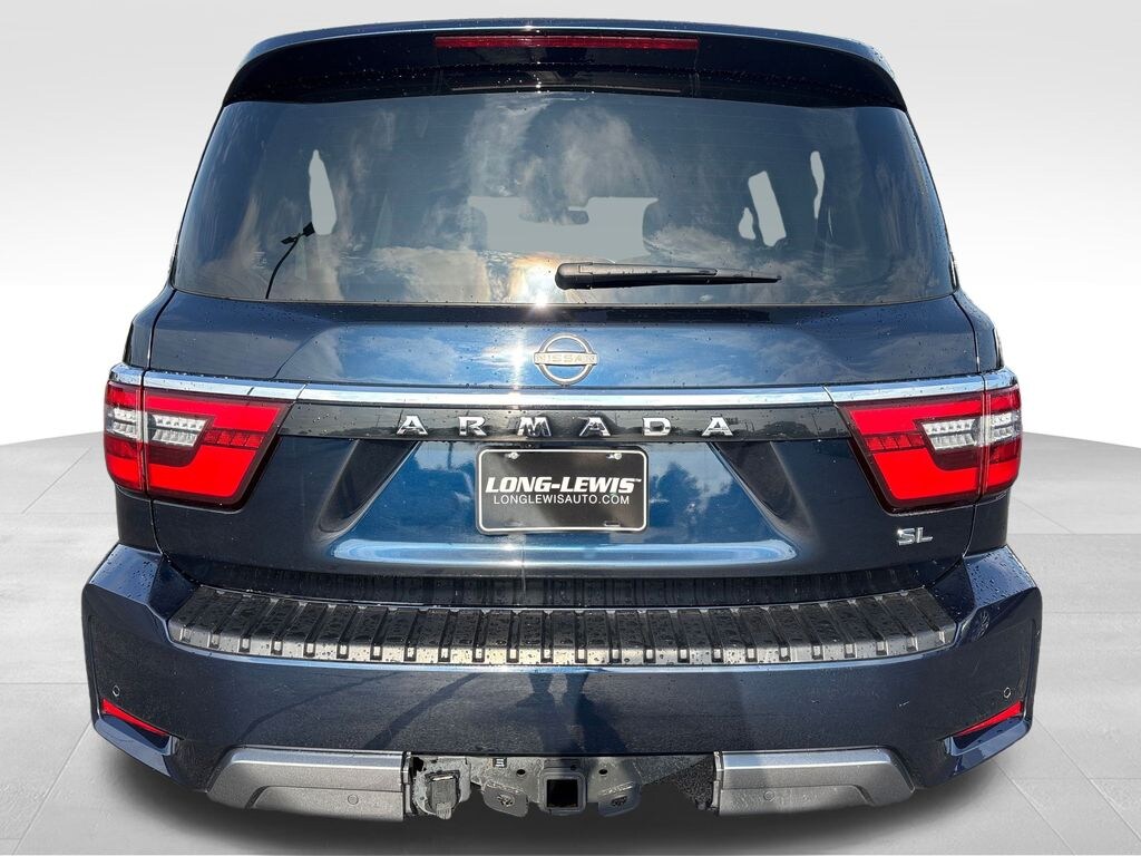 2023 Nissan Armada SL Hermosa Blue Pearl SL RWD 7-Speed Automatic 5.6L V8 DOHC 32V LEV3-ULEV125 400hp 13 Speakers, 2.94 Axle Ratio, 2nd Row Captain's Chairs, 2nd Row Center Console w/Padded Armrest, 3rd Row Carpeted Floor Mats - Captain Seat, 3rd row seats: split-bench, 4-Wheel Disc Brakes, ABS brakes, Air Conditioning, Alloy wheels, AM/FM radio: SiriusXM, Anti-whiplash front head restraints, Auto High-beam Headlights, Auto tilt-away steering wheel, Auto-dimming door mirrors, Auto-dimming Rear-View mirror, Auto-leveling suspension, Automatic temperature control, Bose 13-Speaker Premium Audio System, Brake assist, Bumpers: body-color, Captain's Chairs Package, Delay-off headlights, Driver door bin, Driver vanity mirror, Dual front impact airbags, Dual front side impact airbags, Electronic Stability Control, Emergency communication system: NissanConnect Services, Exterior Parking Camera Rear, Four wheel independent suspension, Front anti-roll bar, Front Bucket Seats, Front Center Armrest, Front dual zone A/C, Front fog lights, Front reading lights, Fully automatic headlights, Garage door transmitter: HomeLink, Heated door mirrors, Heated Front Bucket Seats, Heated front seats, Heated steering wheel, Illuminated entry, Knee airbag, Leather Shift Knob, Leather-Appointed Seat Trim, Low tire pressure warning, Memory seat, Navigation System, NissanConnect featuring Apple CarPlay and Android Auto, Occupant sensing airbag, Outside temperature display, Overhead airbag, Overhead console, Panic alarm, Passenger door bin, Passenger vanity mirror, Power door mirrors, Power driver seat, Power Liftgate, Power moonroof, Power passenger seat, Power steering, Power windows, Premium audio system: Bose, Radio: NissanConnect w/SiriusXM, Rear air conditioning, Rear anti-roll bar, Rear reading lights, Rear seat center armrest, Rear window defroster, Rear window wiper, Reclining 3rd row seat, Remote keyless entry, Security system, Speed control, Speed-sensing steering, Speed-Sensitive Wipers, Split folding rear seat, Spoiler, Steering wheel memory, Steering wheel mounted audio controls, Tachometer, Telescoping steering wheel, Tilt steering wheel, Traction control, Trip computer, Turn signal indicator mirrors, Variably intermittent wipers, Voltmeter, Wheels: 20" x 8J Painted Alloy.
