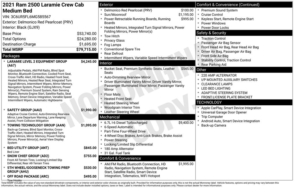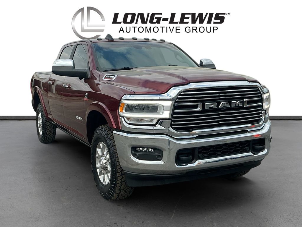 2021 Ram 2500 Laramie Delmonico Red Pearlcoat Laramie 4WD 6-Speed Automatic Cummins 6.7L I6 Turbodiesel 1-Year SiriusXM Guardian Trial, 10 Speakers, 115V Auxiliary Rear Power Outlet, 12" Touchscreen Display, 17 Speaker harman kardon Premium Sound, 2 Way Rear Headrest Seat, 220 Amp Alternator, 2nd Row In Floor Storage Bins, 3.73 Axle Ratio, 4 Way Front Headrests, 4-Wheel Disc Brakes, 4G LTE Wi-Fi Hot Spot, 5-Year SiriusXM Traffic Service, 5-Year SiriusXM Travel Link Service, 5th Wheel/Gooseneck Towing Prep Group, 8.4" Touchscreen Display, ABS brakes, Active Noise Control System, Adaptive Cruise Control w/Stop, Adaptive Steering System, Adjustable pedals, Air Conditioning, Alloy wheels, AM/FM radio: SiriusXM, Anti-Spin Differential Rear Axle, Apple CarPlay, Apple CarPlay/Android Auto, Auto High Beam Headlamp Control, Auto-dimming Rear-View mirror, Automatic temperature control, Bed Utility Group, Blind Spot & Cross Path Detection (DISC), Brake assist, Bumpers: chrome, Clearance Lamps, Compass, CTR Stop Lamp w/Cargo View Camera, Dash Pass Thru Wire Circuits, Delay-off headlights, Digital Rearview Mirror, Disassociated Touchscreen Display, Driver door bin, Driver vanity mirror, Dual front impact airbags, Dual front side impact airbags, Electronic Stability Control, Electronically Controlled Throttle, Exterior Mirrors w/Memory, Foam Bottle Insert (Door Trim Panel), For Details Visit DriveUconnect.com, Front anti-roll bar, Front Center Armrest w/Storage, Front dual zone A/C, Front fog lights, Front License Plate Bracket, Front Performance Tuned Shock Absorbers, Front reading lights, Front Seat Back Map Pockets, Full Speed Forward Collision Warning Plus, Fully automatic headlights, Garage door transmitter, Google Android Auto, GPS Antenna Input, GPS Navigation, HD Radio, Heated door mirrors, Heated Front Seats, Heated front seats, Heated Second Row Seats, Heated Steering Wheel, Heated steering wheel, Hill Descent Control, I/P Mounted Auxiliary Switches, Illuminated entry, Integrated Center Stack Radio, Integrated Voice Command w/Bluetooth, Lane Keep Assist, Laramie Level 2 Equipment Group (DISC), Leather steering wheel, Leather Trim 40/20/40 Bench Seat, LED Bed Lighting, Low tire pressure warning, Mirror-Mounted Aux Reverse Lamps, MOPAR Deployable Bed Step, MOPAR Spray In Bedliner, Occupant sensing airbag, Off Road Decal, Off Road Package, Off-Road Information Pages, Outside temperature display, Overhead airbag, Overhead console, Panic alarm, ParkView Rear Back-Up Camera, Passenger door bin, Passenger vanity mirror, Power 2-Way Driver Lumbar Adjust, Power 2-Way Passenger Lumbar Adjust, Power Adjust 8-Way Driver Seat, Power Adjust 8-Way Front Passenger Seat, Power Adjustable Convex Aux Mirrors, Power Adjustable Pedals w/Memory, Power Chrome Tow Mirrors w/Convex Spotter & Memory, Power Deployable Running Boards, Power door mirrors, Power driver seat, Power passenger seat, Power steering, Power Sunroof, Power windows, Protection Group, Quick Order Package 2HH Laramie, Radio data system, Radio: Uconnect 12.0 w/Navigation, Radio: Uconnect 4 w/8.4" Display, Radio: Uconnect 4C Nav w/8.4" Display, Radio/Driver Seat/Mirrors/Pedals Memory, Rain Sensitive Windshield Wipers, Rear 60/40 Folding Seat, Rear anti-roll bar, Rear Performance Tuned Shock Absorbers, Rear reading lights, Rear seat center armrest, Rear step bumper, Rear window defroster, Remote keyless entry, Remote Tailgate Release, Safety Group (DISC), Security system, SiriusXM Satellite Radio, SiriusXM Traffic Plus, SiriusXM Travel Link, SiriusXM w/360L, Snow Chief Group, Speed control, Split folding rear seat, Steering wheel mounted audio controls, Surround View Camera System, Tachometer, Tilt steering wheel, Tip Start, Tow Hooks, Towing Technology Group (DISC), Traction control, Trailer Reverse Guidance, Trip computer, Turn signal indicator mirrors, Variably intermittent wipers, Vendor Painted Cargo Box Tracking, Ventilated Front Seats, Voltmeter, Wheels: 18" x 8.0" Polished Aluminum