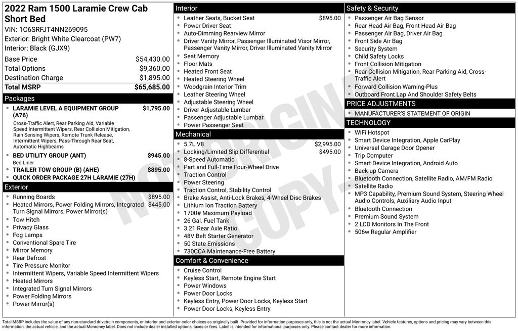 2022 Ram 1500 Laramie Bright White Clearcoat Laramie 4WD 8-Speed Automatic HEMI 5.7L V8 Multi Displacement VVT #1 Seat Foam Cushion, 10 Speakers, 2nd Row In Floor Storage Bins, 3 Rear Seat Head Restraints, 3.21 Rear Axle Ratio, 4 Way Front Headrests, 4-Wheel Disc Brakes, 48V Belt Starter Generator, 4G LTE Wi-Fi Hot Spot, 8.4" Touchscreen Display, ABS brakes, Adjustable pedals, Air Conditioning, Alloy wheels, AM/FM radio: SiriusXM, Anti-Spin Differential Rear Axle, Apple CarPlay, Apple CarPlay/Android Auto, Audio memory, Auto High Beam Headlamp Control, Auto-dimming door mirrors, Auto-Dimming Exterior Driver Mirror, Auto-dimming Rear-View mirror, Automatic temperature control, Bed Utility Group, Brake assist, Bumpers: chrome, Chrome Exterior Mirrors, Chrome Power-Fold Trailer Tow Mirrors, Compass, Connectivity - US/Canada, Convex Wide-Angle Mirror Insert, Delay-off headlights, Driver door bin, Driver Seat Memory, Driver vanity mirror, Dual front impact airbags, Dual front side impact airbags, Electronic Stability Control, Exterior Mirrors Courtesy Lamps, Exterior Mirrors w/Heating Element, Exterior Mirrors w/Memory, Exterior Mirrors w/Supplemental Signals, Foam Bottle Insert (Door Trim Panel), For Details, Visit DriveUconnect.com, Front anti-roll bar, Front Center Armrest w/Storage, Front dual zone A/C, Front fog lights, Front License Plate Bracket, Front reading lights, Front Seat Back Map Pockets, Front wheel independent suspension, Fully automatic headlights, Garage door transmitter, Global Telematics Box Module (TBM), Google Android Auto, GPS Antenna Input, Heated door mirrors, Heated Front Seats, Heated front seats, Heated Steering Wheel, Heated steering wheel, Heavy-Duty Engine Cooling, Illuminated entry, Integrated Center Stack Radio, Laramie Level A Equipment Group (DISC), Leather steering wheel, Leather Trim 40/20/40 Bench Seat, Low tire pressure warning, Manufacturer's Statement of Origin, Memory seat, Mirror Clearance/Running Lights, Mirror-Mounted Aux Reverse Lamps, MOPAR 4 Adjustable Cargo Tie-Down Hooks, Occupant sensing airbag, Outside temperature display, Overhead airbag, Overhead console, Panic alarm, ParkSense Front/Rear Park Assist w/Stop, ParkView Rear Back-Up Camera, Passenger door bin, Passenger vanity mirror, Pedal memory, Pick-Up Box Lighting, Power 2-Way Driver Lumbar Adjust, Power 2-Way Passenger Lumbar Adjust, Power 8-Way Driver & Passenger Seats, Power door mirrors, Power driver seat, Power passenger seat, Power steering, Power windows, Power-Folding Mirrors, Quick Order Package 27H Laramie, Radio data system, Radio: Uconnect 5 W w/8.4" Display, Rain Sensitive Windshield Wipers, Rear 60/40 Folding Seat, Rear 60/40 Folding Split Recline Seat, Rear anti-roll bar, Rear seat center armrest, Rear step bumper, Rear window defroster, Remote keyless entry, Remote Tailgate Release, Security system, SiriusXM Radio Service, Speed control, Split folding rear seat, Steering wheel mounted audio controls, Tachometer, Telescoping steering wheel, Tilt steering wheel, Traction control, Trailer Brake Control, Trailer Light Check, Trailer Tow Group (B) (DISC), Trailer Tow Mirrors, Trip computer, Turn signal indicator mirrors, Variably intermittent wipers, Ventilated Front Seats, Ventilated front seats, Voltmeter, Wheel to Wheel Side Steps, Wheels: 18" x 8" Aluminum Base Painted.