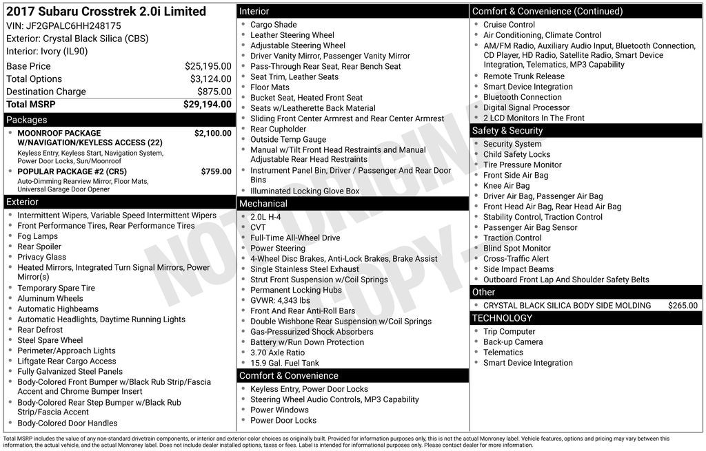 2017 Subaru Crosstrek 2.0i Limited Crystal Black Silica 2.0i Limited AWD Lineartronic CVT 2.0L 16V DOHC 17" x 7.0J Aluminum Alloy Wheels, 3.70 Axle Ratio, 4-Wheel Disc Brakes, 6 Speakers, ABS brakes, Air Conditioning, All Weather Floor Mats, Alloy wheels, AM/FM radio: SiriusXM, Auto High-beam Headlights, Auto-Dimming Mirror w/Compass & HomeLink, Automatic temperature control, Brake assist, Bumpers: body-color, CD player, Crystal Black Silica Body Side Molding, Driver door bin, Driver vanity mirror, Dual front impact airbags, Dual front side impact airbags, Electronic Stability Control, Emergency communication system, Exterior Parking Camera Rear, Four wheel independent suspension, Front anti-roll bar, Front Bucket Seats, Front Center Armrest, Front fog lights, Front reading lights, Fully automatic headlights, Heated door mirrors, Heated Front Bucket Seats, Heated front seats, Illuminated entry, Keyless Access w/Push-Button Start, Knee airbag, Leather Shift Knob, Leather-Trimmed Upholstery, Low tire pressure warning, Moonroof Package w/Navigation/Keyless Access, Navigation System, Occupant sensing airbag, Outside temperature display, Overhead airbag, Panic alarm, Passenger door bin, Passenger vanity mirror, Popular Package #2, Power door mirrors, Power Moonroof, Power steering, Power windows, Radio data system, Radio: Subaru Starlink 7.0" Multimedia Plus System, Rear anti-roll bar, Rear Bumper Cover, Rear Seat Back Protector, Rear seat center armrest, Rear window defroster, Rear window wiper, Remote keyless entry, Roof rack: rails only, Security system, Speed control, Speed-sensing steering, Splash Guards, Split folding rear seat, Spoiler, Steering wheel mounted audio controls, Subaru Starlink Smartphone Integration, Tachometer, Telescoping steering wheel, Tilt steering wheel, Traction control, Trip computer, Turn signal indicator mirrors, Variably intermittent wipers.