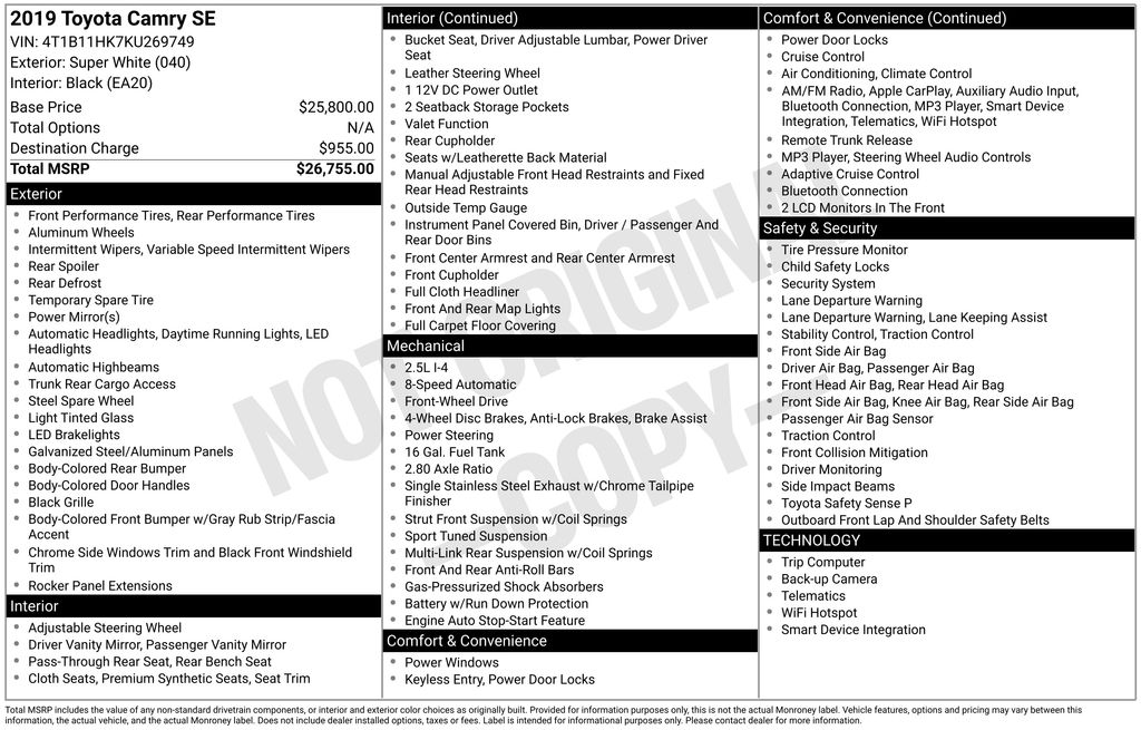 2019 Toyota Camry L White L FWD 8-Speed Automatic 2.5L I4 DOHC 16V Cloth, 4-Wheel Disc Brakes, 6 Speakers, 6.5J x 16" Steel Wheels, ABS brakes, Air Conditioning, AM/FM radio, Apple CarPlay, Auto High-beam Headlights, Brake assist, Bumpers: body-color, Delay-off headlights, Driver door bin, Driver vanity mirror, Dual front impact airbags, Dual front side impact airbags, Electronic Stability Control, Emergency communication system: Safety Connect, Exterior Parking Camera Rear, Fabric Seat Trim, Four wheel independent suspension, Front anti-roll bar, Front Bucket Seats, Front Center Armrest, Front reading lights, Fully automatic headlights, Illuminated entry, Knee airbag, Low tire pressure warning, Occupant sensing airbag, Outside temperature display, Overhead airbag, Overhead console, Panic alarm, Passenger door bin, Passenger vanity mirror, Power door mirrors, Power steering, Power windows, Radio data system, Radio: Entune 3.0 Audio w/App Suite, Rear anti-roll bar, Rear reading lights, Rear side impact airbag, Rear window defroster, Remote keyless entry, Speed control, Speed-sensing steering, Steering wheel mounted audio controls, Tachometer, Telescoping steering wheel, Tilt steering wheel, Traction control, Trip computer, Variably intermittent wipers, Cloth.