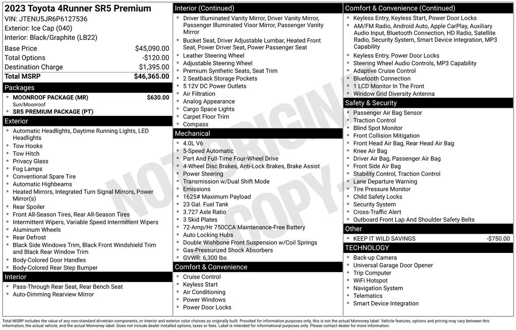 2023 Toyota 4Runner SR5 Premium White SR5 Premium 4WD 5-Speed with ECT 4.0L V6 DOHC 24V 4WD, 17" 6-Spoke Alloy Wheels, 3.727 Axle Ratio, 4-Wheel Disc Brakes, 8 Speakers, ABS brakes, Air Conditioning, Alloy wheels, AM/FM radio: SiriusXM, Anti-whiplash front head restraints, Apple CarPlay/Android Auto, Auto High-beam Headlights, Auto-dimming Rear-View mirror, Brake assist, Bumpers: body-color, Compass, Driver door bin, Driver vanity mirror, Dual front impact airbags, Dual front side impact airbags, Electronic Stability Control, Emergency communication system: Safety Connect (1-year trial), Exterior Parking Camera Rear, Front anti-roll bar, Front Bucket Seats, Front Center Armrest, Front fog lights, Front reading lights, Front wheel independent suspension, Garage Door Opener, Garage door transmitter: HomeLink, Heated door mirrors, Heated Front Bucket Seats, Heated front seats, Heated Outside Rear-View Mirrors, Illuminated entry, Knee airbag, Leather Shift Knob, Leather steering wheel, Low tire pressure warning, Navigation System, Occupant sensing airbag, Outside temperature display, Overhead airbag, Overhead console, Panic alarm, Passenger door bin, Passenger vanity mirror, Power door mirrors, Power driver seat, Power passenger seat, Power steering, Power windows, Radio: Premium Audio w/Dynamic Navigation, Rear anti-roll bar, Rear seat center armrest, Rear window defroster, Rear window wiper, Remote keyless entry, Security system, SofTex Seat Trim, Speed control, Speed-sensing steering, Split folding rear seat, Spoiler, Steering wheel mounted audio controls, Tachometer, Telescoping steering wheel, Tilt steering wheel, Traction control, Trip computer, Turn signal indicator mirrors, Variably intermittent wipers, 4WD.