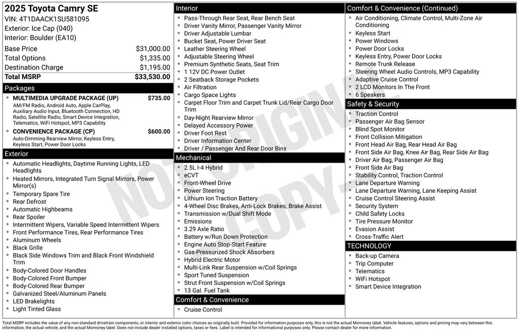 2025 Toyota Camry White FWD eCVT 2.5L 4-Cylinder 16V DOHC 2.5L 4-Cylinder 16V DOHC, 4-Wheel Disc Brakes, 6 Speakers, ABS brakes, Air Conditioning, Alloy wheels, AM/FM radio: SiriusXM, Apple CarPlay/Android Auto, Auto High-beam Headlights, Automatic temperature control, Brake assist, Bumpers: body-color, Delay-off headlights, Driver door bin, Driver vanity mirror, Dual front impact airbags, Dual front side impact airbags, Electronic Stability Control, Emergency communication system: Safety Connect (up to 10-year trial subscription), Exterior Parking Camera Rear, Four wheel independent suspension, Front anti-roll bar, Front Bucket Seats, Front Center Armrest, Front dual zone A/C, Front reading lights, Fully automatic headlights, Heated door mirrors, Illuminated entry, Knee airbag, Low tire pressure warning, Occupant sensing airbag, Outside temperature display, Overhead airbag, Overhead console, Panic alarm, Passenger door bin, Passenger vanity mirror, Power door mirrors, Power steering, Power windows, Radio data system, Rear anti-roll bar, Rear seat center armrest, Rear side impact airbag, Rear window defroster, Remote keyless entry, Security system, Speed control, Speed-sensing steering, Split folding rear seat, Steering wheel mounted audio controls, Telescoping steering wheel, Tilt steering wheel, Traction control, Trip computer, Turn signal indicator mirrors, Variably intermittent wipers, 2.5L 4-Cylinder 16V DOHC.