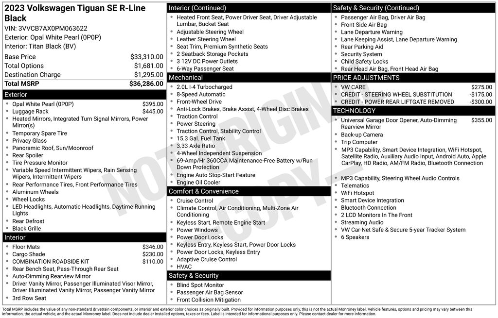 2023 Volkswagen Tiguan 2.0T SE R-Line Black Opal White 2.0T SE R-Line Black FWD 8-Speed Automatic with Tiptronic 2.0L TSI DOHC 3-Row Rubber Monster Mats w/Logo Kit (Set of 5), 3.33 Axle Ratio, 3rd row seats: bench, 4-Wheel Disc Brakes, 4-Wheel Independent Suspension, 6 Speakers, ABS brakes, Air Conditioning, Alloy wheels, AM/FM radio: SiriusXM with 360L, Auto-dimming Rear-View mirror, Auto-Dimming Rearview Mirror w/Compass/HomeLink (DISC), Automatic temperature control, Brake assist, Bumpers: body-color, Cargo Area Retractable Privacy Cover, Compass, Credit - Power Rear Liftgate Removed, Credit - Steering Wheel Substitution, Delay-off headlights, Driver door bin, Driver vanity mirror, Dual front impact airbags, Dual front side impact airbags, Electronic Stability Control, Emergency communication system: VW Car-Net Safe & Secure 5-year, Exterior Parking Camera Rear, First Aid Kit, Four wheel independent suspension, Front anti-roll bar, Front Bucket Seats, Front Center Armrest, Front dual zone A/C, Front reading lights, Fully automatic headlights, Heated door mirrors, Heated Front Comfort Seats, Heated front seats, Heavy Duty Trunk Liner w/VW CarGo Blocks, Illuminated entry, Leather Shift Knob, Leather steering wheel, Low tire pressure warning, Occupant sensing airbag, Outside temperature display, Overhead airbag, Overhead console, Panic alarm, Passenger door bin, Passenger vanity mirror, Perforated V-Tex Leatherette Seating Surfaces, Power door mirrors, Power driver seat, Power Liftgate, Power moonroof, Power steering, Power windows, Radio data system, Radio: MIB3 Composition Media AM/FM/HD, Rain sensing wipers, Rear anti-roll bar, Rear reading lights, Rear seat center armrest, Rear window defroster, Rear window wiper, Remote keyless entry, Roadside Assistance Kit, Roof Rack Base Carrier Bars (Set of 2), Security system, Speed control, Speed-sensing steering, Split folding rear seat, Spoiler, Sport steering wheel, Steering wheel mounted audio controls, Tachometer, Telescoping steering wheel, Tilt steering wheel, Traction control, Trip computer, Turn signal indicator mirrors, Variably intermittent wipers, VW Care, Wheels: 19" Black Painted Twin 5-Spoke Alloy.