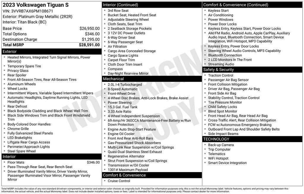 2023 Volkswagen Tiguan 2.0T S Platinum Gray Metallic 2.0T S FWD 8-Speed Automatic with Tiptronic 2.0L TSI DOHC 3-Row Rubber Monster Mats w/Logo Kit (Set of 5), 3.33 Axle Ratio, 3rd row seats: bench, 4-Wheel Disc Brakes, 4-Wheel Independent Suspension, 6 Speakers, ABS brakes, Air Conditioning, Alloy wheels, AM/FM radio, Brake assist, Bumpers: body-color, Cloth Seating Surfaces, Compass, Delay-off headlights, Driver door bin, Driver vanity mirror, Dual front impact airbags, Dual front side impact airbags, Electronic Stability Control, Emergency communication system: VW Car-Net Safe & Secure 5-year, Exterior Parking Camera Rear, Forward collision: FCW w/Autonomous Emergency Braking mitigation, Four wheel independent suspension, Front anti-roll bar, Front Bucket Seats, Front Center Armrest, Front reading lights, Fully automatic headlights, Heated door mirrors, Heated Front Bucket Seats, Heated front seats, Heavy Duty Trunk Liner w/VW CarGo Blocks, Illuminated entry, Leather Shift Knob, Low tire pressure warning, Occupant sensing airbag, Outside temperature display, Overhead airbag, Overhead console, Panic alarm, Passenger door bin, Passenger vanity mirror, Power door mirrors, Power steering, Power windows, Radio data system, Radio: Composition Color AM/FM, Rear anti-roll bar, Rear reading lights, Rear seat center armrest, Rear window defroster, Rear window wiper, Remote keyless entry, Speed control, Speed-sensing steering, Split folding rear seat, Spoiler, Steering wheel mounted audio controls, Tachometer, Telescoping steering wheel, Tilt steering wheel, Traction control, Trip computer, Turn signal indicator mirrors, Variably intermittent wipers, VW Car-Net Safe & Secure 5-Year Plan, Wheels: 17" 2-Tone Machined Twin 5-Spoke Alloy.